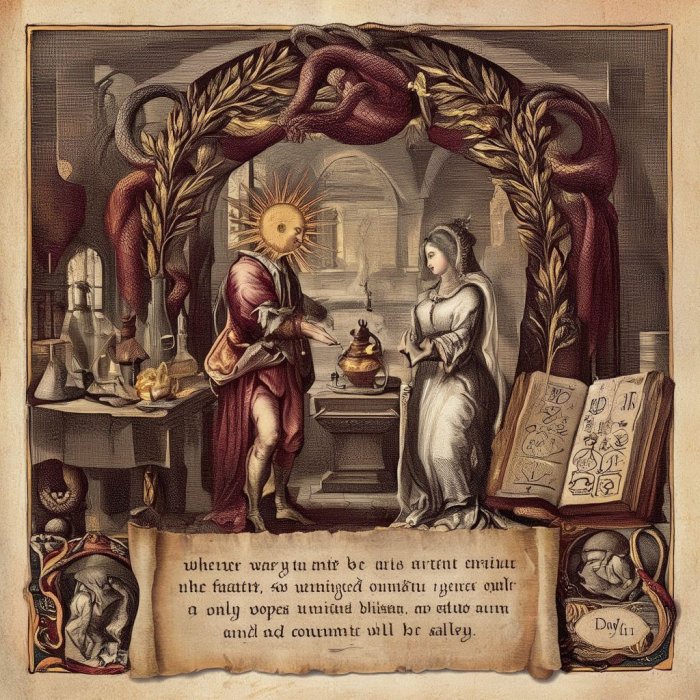 6 Ovu zagonetku je riješio G. W. von Leibniz (1646-1716). Gospa se zove Alkemija (ALCHIMIA), a numerička vrijednost brojeva je odreñena na osnovu njihovog rednog broja u alfabetu, dakle A=1, B=2, C=3 i tako dalje. Andreae, koji je bio odličan matematičar, zakomplicirao je ovu zagonetku tako što iz rečenice "posljednje i prvo slovo su takoñer jednaki, i zajedno s drugim čine šesto", na prvi pogled izgleda kao da treba zbrojiti zbir prvog i posljednjeg slova s drugim (1+1+12=14) dok, zapravo, treba zbrojiti samo jedno od ta dva jednaka slova (1+12=13) da bi se dobio točan rezultat. Rečenica je tako sročena da namjerno navodi na stranputicu, mada, u stvari, dozvoljava oba značenja.