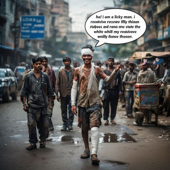 Neki bijednik dobio je od vlade pedeset tisa rupija, jer mu se desila nesreća dok je putovao vlakom. Kosti su mu bile prelomljene na nekoliko mjesta, zadobio je frakturu lubanje, no i pored svega bio je neizmjerno sretan zbog onih pedeset tisuća rupija.