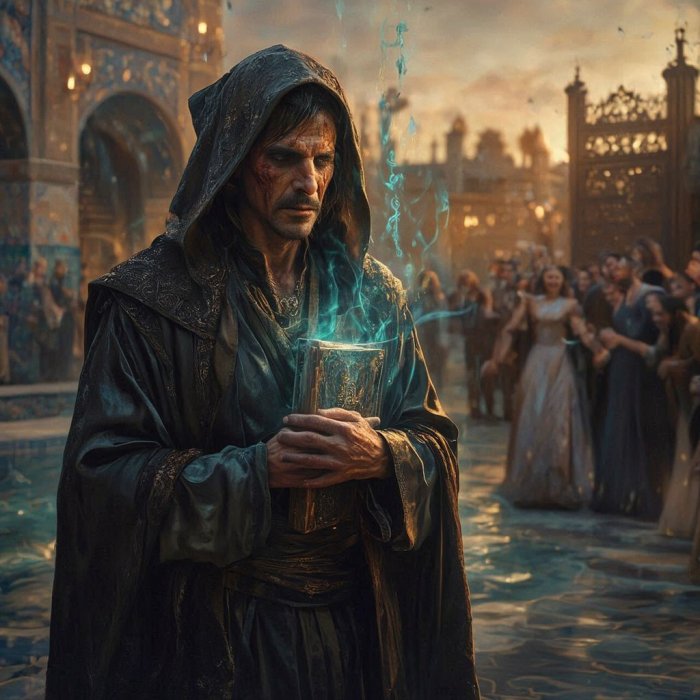 Onamo je otputovao i sa sobom kući donio mnoga znanja o vještinama magije, tako da može učiniti što god želi. Zbog sramote što se dogodila njegovom tijelu, mrzi sve ugledne muževe i žene i veseli se u dubini srca može li im razoriti veselje.