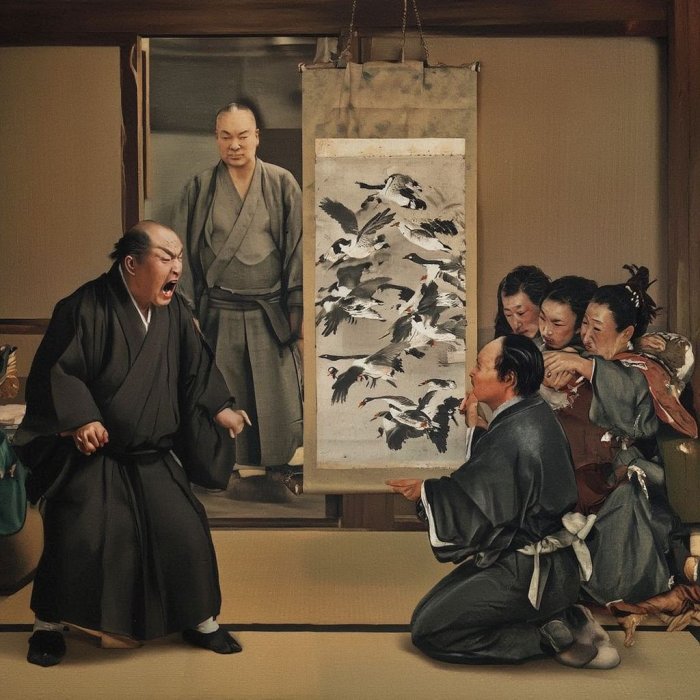 Jednog dana gospodar Mihara narucio je slikara da mu naslika sliku i poslije nekoliko nedjelja umjetnik mu je donio sliku sa divljim guskama. Cim je ugledao sliku, gospodar je povikao, "Divlje guske lete jedna pored druge. Tvoja slika je olicenje pobune!"