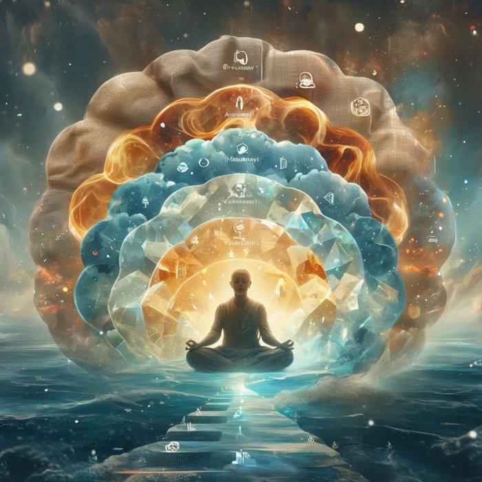 U sistemu vedante postoji pet razina svijesti koje se moraju prijeći da bi se stiglo do oceana istinskoga sebstva, do stanja potpune jednosti s Bogom. Svaka razina smatra se omotačem koji pokriva jednu suptilniju razinu ispod njega. Neprestanom kontemplacijom o tim omotačima svijesti, duhovni aspirant postiže sposobnost diskriminacije pomoću koje napreduje od jedne do druge razine, to jest do sve dubljeg poimanja stvarnosti. Korak po korak, on napušta jedan sloj za drugim, dok konačno ne postane sposoban nadvladati sve njih i postići spoznaju svoje jednosti s Bogom.