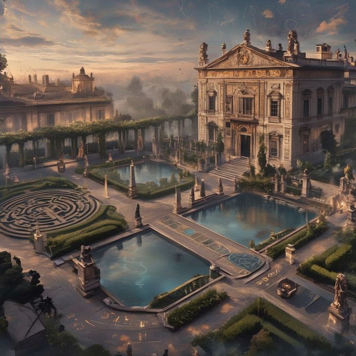 mansku ili magijsku cjelinu, ujedinjenu u harmoničnim omjerima. Prema Albertiju, primjerice, vrt je, jednako kao i sama zgrada, bio arhitektovom domenom. Ali, i vrt je, također, mogao biti magični talisman. Mogao se, na primjer, podijeliti na četvrtine, predstavlja jući tako četiri elementa - zemlju, zrak, vatru i vodu. Mogao se podi jeliti na dvanaest dijelova, odražavajući dvanaest znakova zodijaka. Na određenim mjestima u vrtu, mogle su se nalaziti špilje, oltari, cvjetnjaci, labirinti, čitav složeni sustav oblika, mirisa i boja, koji je mogao invocirati kozmičke energije.