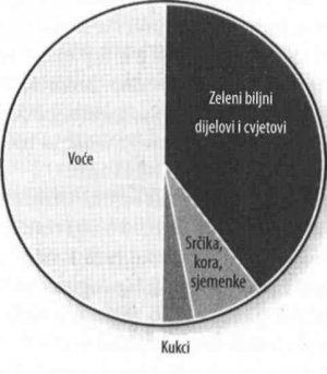 Kao što možete vidjeti, dvije glavne skupine namir nica za čimpanze su voće i zelenje. Molim vas, nemojte zelenje brkati s korjenastim povrćem kao što je mrkva, cikla ili krumpir. Također nemojte brkati zelenje s ne sla tkim voćem kao što su krastavac, rajčica, tikvica i paprika. Čimpanze korjenasto povrće jedu samo u slučajevima suše ili gladi, kao zadnju opciju.9 Prema