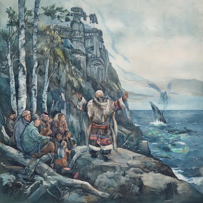 (kosatka) prati veći. Jedan je Gilyak objasnio Shternbergu da je manji kosatka mač većega. Pritom samo prividno nalikuje kosatki, jer je ustvari mač. A veći kosatka zapravo ima oblik lovca.Shternberg izvješćuje da mu je jedan Gilyak (1933., str. 50) rekao da je ono što nama izgleda kao morska životinja, zapravo lađa Gilyakova duha
