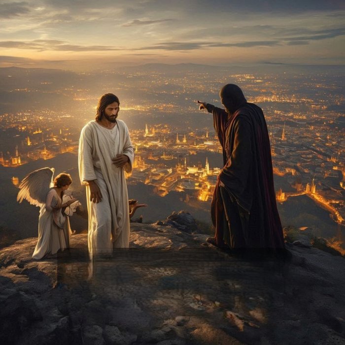 "Ponovno ga odvede đavao na goru vrlo visoku te mu pokaza sva kraljevstva ovoga svijeta i njihovu raskoš, pa mu reče: 'Sve ću ti ovo dati ako padneš ničice te mi se pokloniš'.