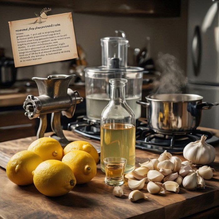 Limun i češnjak samljeti na mašini za meso ili u multipraktiku, dodati vodu i pustiti da zakipi, skinuti sa vatre, poklopiti i ostaviti da se ohladi. Kad se ohladilo procjediti i sipati u bocu i držati u frižideru. Svako jutro popiti po jednu čašicu od rakije. Može se piti i prije ručka. Piti 21 dan, napraviti pauzu od 8-10 dana pa ponoviti. U toku godine smije se piti samo dva puta.