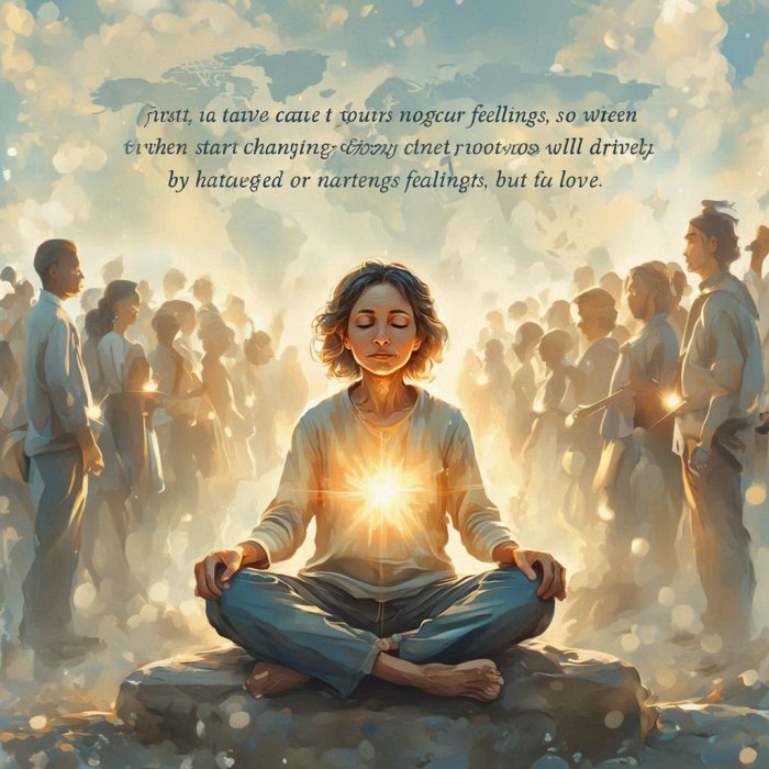 Nemojte tražiti od svijeta da se pro -mijeni-promijenite prvo sebe. Tada ćete dobiti dovoljno dobar pogled na svijet da budete sposobni promi -jeniti što god smatrali nužnim da se promijeni. Uklonite prvo brvno iz svojeg oka. Ako to ne učinite, izgubit ćete pravo da mijenjate bilo koga i bilo što. Dok niste svjesni samog sebe nemate pravo dirati bilo koga, niti se upuštati u mije-njanje bilo čega u svijetu. Kada po -kušavate promijeniti ljude ili stva-ri postoji opasnost da to činite zbog vlastite koristi, ponosa, dogmatskih uvjerenja i mišljenja, ili samo zato da ispraznite svoje negativne osje-ćaje. Imam negativne osjećaje i zato se morate promijeniti tako da se ja osjećam dobro. Prvo se pobrinite za svoje negativne osjećaje tako da, kada krenete mijenjati druge, nećete biti potaknuti mržnjom ili negativnim osjećaji-ma nego ljubavlju.