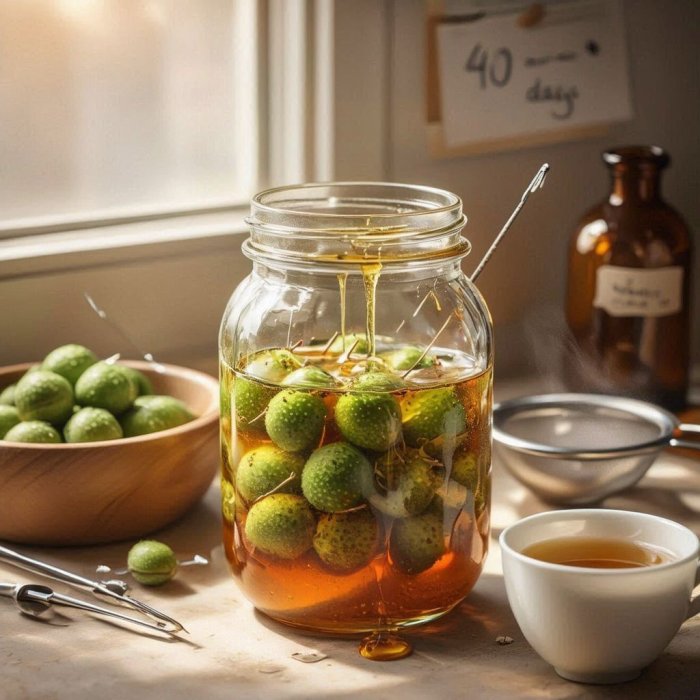 Svaki orah izbosti na vise mjesta sa iglom.Orahe stavit u teglu i prelit medom.