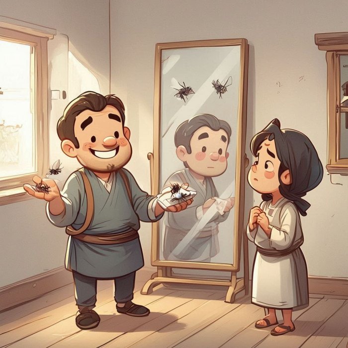 Žena je bila iskreno zbunjena: “Kako to misliš: dvije muške i dvije ženske? Kako si mogao znati koja muha je muška a koja ženska?” “Ne brini, draga”, odgovori joj Nasrudin samouvjereno, “dvije sam ubio na ogledalu!”