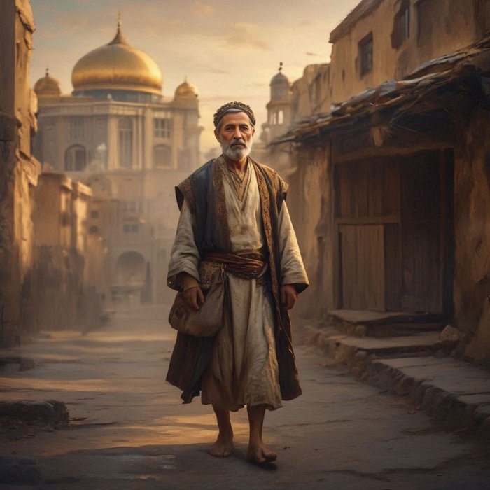 Tog istog dana; međutim, baš negdje oko podne, neki siromašni fakir se pojavio ispred ulaza u palaču, i zapovjedničkim glasom obratio se stražaru: “Pusti me da uđem, jer bih želio par dana ostati u ovom prenoćištu. Hajde, daj mi da bar jedno tjedan dana živim u ovom saraju”.