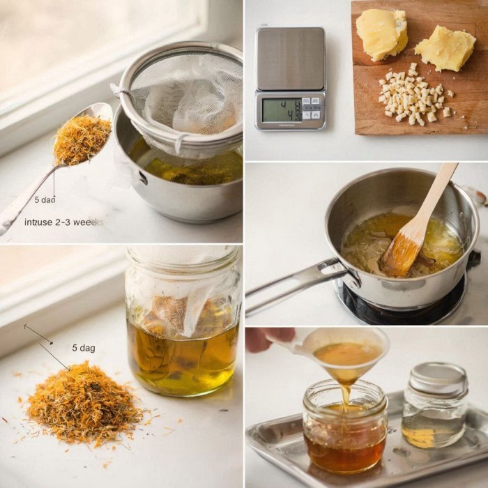 1. Osušenih 5 dag cvjetova nevena preliti s 1/2 l maslinova ulja ili ulja od kikirikija, dobro zatvoriti u staklenku i držati 2 do 3 tjedna na toplom mjestu.
