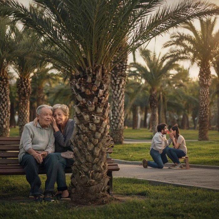 Mula Nasrudin i njegova žena sjedili su na klupi u parku, iza palmi. Iznenada su postali svjesni nečijeg prisustva - neki mladi par sjeo je s druge strane. Mladić je počeo svoju djevojku prositi na veoma romantičan način - riječi su mu bile krcate pjesmama i zanosom ljubavi. Nasrudinova žena se počela vrpoljiti, nije joj bilo prijatno - jer prisustvovati tako bliskim trenucima uvijek stvara nelagodnost.