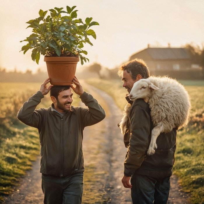 Jednoga jutra baštovan je išao ka gazdinoj kući sa saksijom na glavi, a u saksiji se nalazila prekrasna zelena biljka, u čije uzgajanje je uložio veliki trud. Usput je sreo prijatelja, čobanina, koji je išao kući sa ovcom prebačenom preko ramena. Baštovan već izvesno vreme nije video čobanina. Pozdravio ga je širokim osmehom i zapodenuli su razgovor. Kada su razmenili novosti, svaki je produžio svojim putem. Baštovan je želeo da baci pogled na biljku pre nego što uđe u gazdinu kuću. Spustio je saksiju sa glave i, na svoj užas, ustanovio da u njoj nije ostalo ni lista, ništa do gola stabljika. Ovca koju je njegov prijatelj nosio preko ramena pojela je sve lišće dok je on bio zauzet razgovorom. Kako da se pojavi pred gazdom bez biljke? Stoga se vratio u baštu, krajnje razočaran.