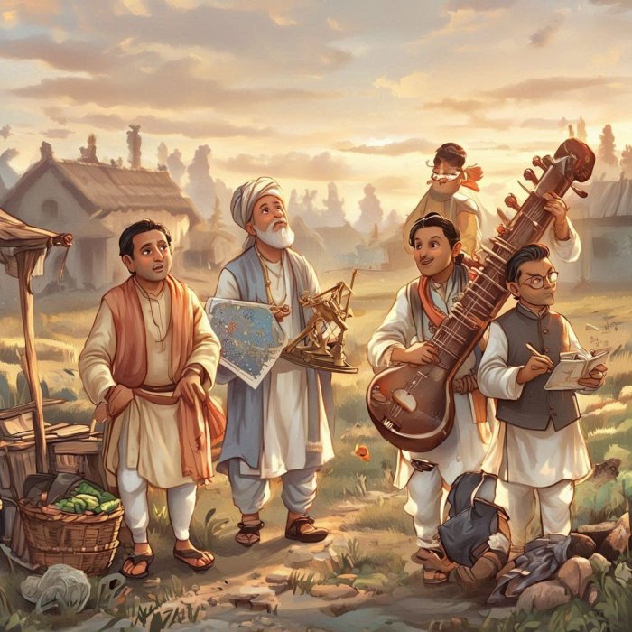 Jednom su četiri obrazovana naučnika – ajurvedski lekar, astrolog, muzičar i logičar – trebali da provedu dan na selu. Svaki od njih bio je veoma upućen u svoju nauku, istaknuti autoritet u svojoj oblasti, ali bez životne mudrosti.