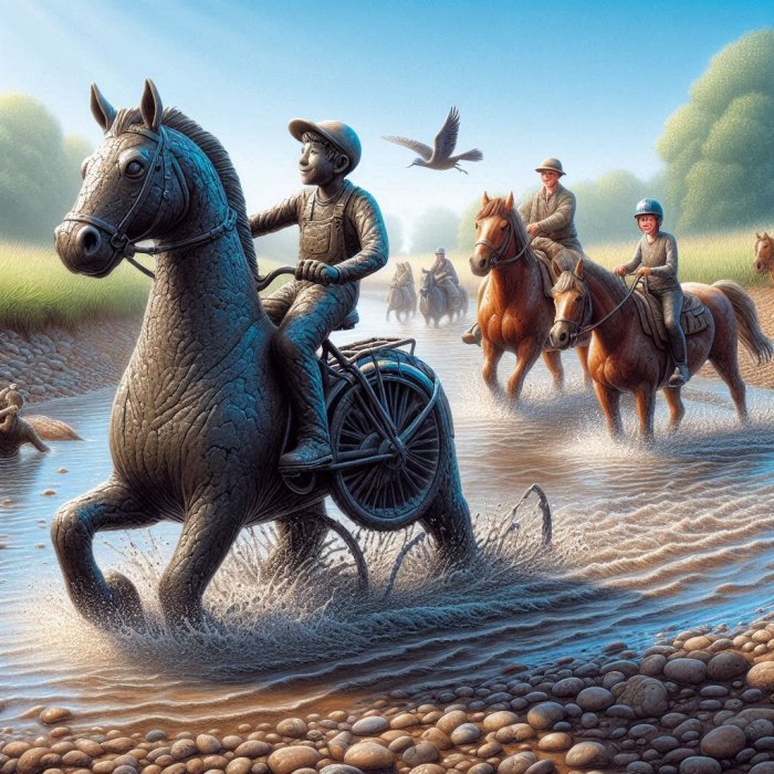 Izuzetno pametan mladi čovek pretvorio je svoj bicikl u konja divnog izgleda. Konj je bio napravljen od blata. Kada bi vozio bicikl, izgledalo je kao da jaše tog blato-konja. Nastavio je da se pretvara da je u pitanju veoma rasan konj, koji može da pretrči isto koliko i svaki drugi konj. Odlazio je u rekreativne šetnje sa prijateljima koji su jahali prave konje. Jednoga dana su stigli do rečice i krenuli u njen prelazak. Čovek sa blato-konjem razmišljao je: «Kada se zemljane posude potope u vodu, one ostanu čitave. Tako će i moj konj ostati čitav čak i u vodi. Ja mogu da pređem ovaj potok.» I ušao je u vodu; ali, kada je stigao nasred rečice, blato-konj je onemoćao i raspao se, povukavši za sobom jahača i sahranivši ga u rečno korito. Ostali su shvatili da je konj bio napravljen od nepečenog blata i nastavili svojim putem.
