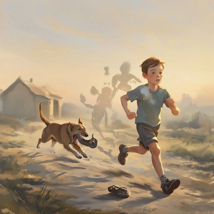 Pas je zalajao na dečaka i ovaj je počeo da trči. Pas je počeo da ga juri; dečak je shvatio da ga cipele usporavaju, pa je pustio da mu spadnu sa nogu. Ostavio ih je iza sebe, a pas je smesta zgrabio jednu od njih i otrčao od dečaka, koji je zatim bezbedno otišao kući.