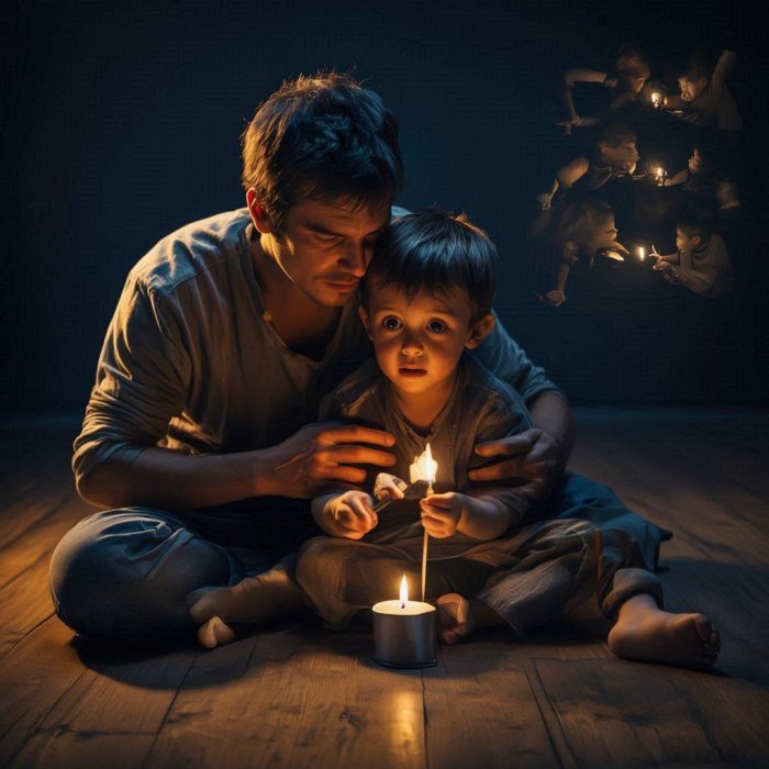 Sin gasi sveću. «O, opet je mračno, oče. Bojim se.»