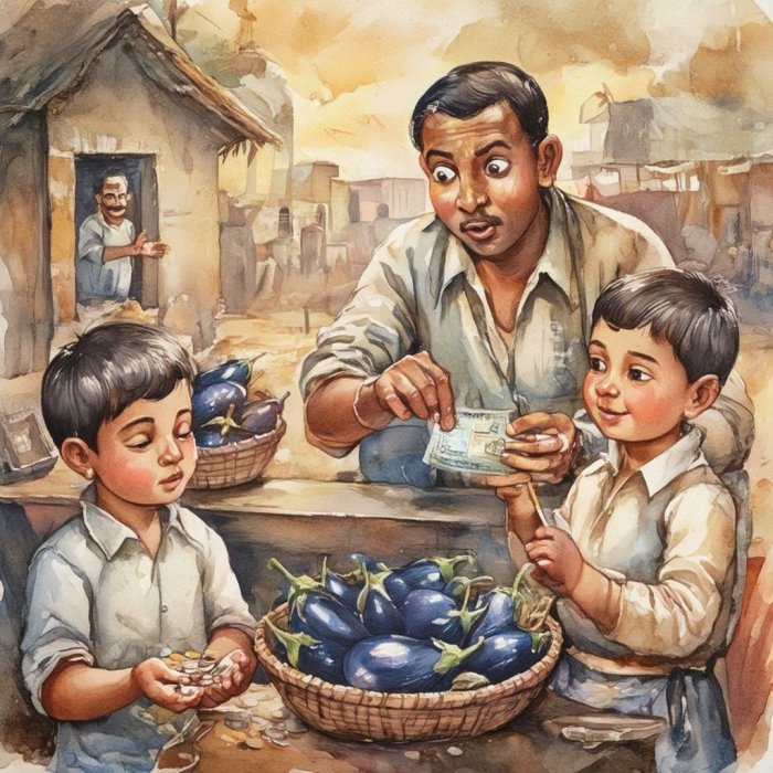 Jedan čovek imao je dva sina. Jednoga dana obojici je dao po deset rupija i rekao im: «Potrošite tih deset rupija kako vam volja, ali mi donesite plavih patlidžana za večeru.»