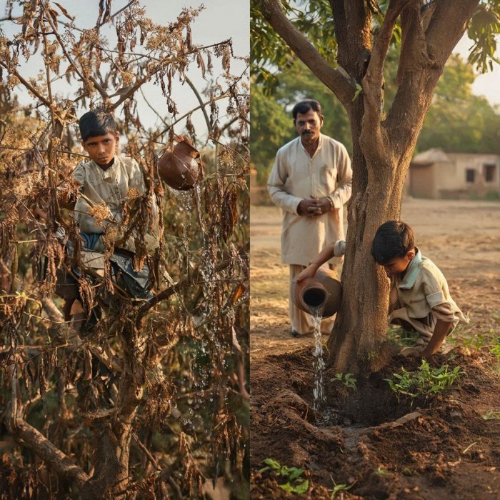 Otac je poželeo da ispita inteligenciju svoja dva sina. Obojici je dodelio zadatak da paze na po jedno drvo mangoa, obećavši nagradu onome čije drvo donese vrhunske plodove u izobilju. Budalasti dečak ustanovio je da se lišće suši, a da cvetovi rastu na krajevima grana. Brzo se popeo na drvo i pažljivo zalio svaki list. Lišće je i dalje venulo i drvo je na kraju propalo. Mudri dečak, s druge strane, zalivao je koren, i to drvo je bilo zeleno i zdravo i donelo je ukusne plodove u izobilju.