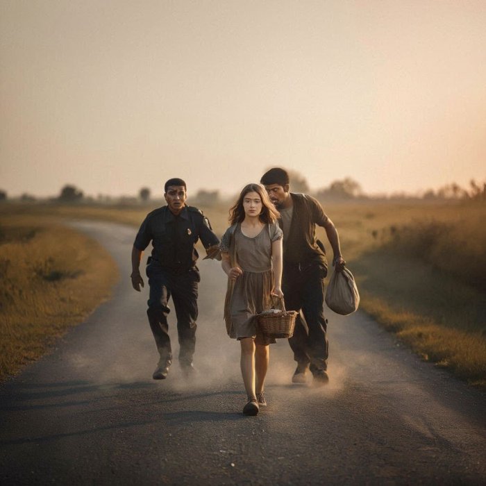 Ozloglašeni razbojnik bio je zamalo uhvaćen na delu od strane policajca. Sa plenom u ruci, počeo je da beži, a policajac se dao u poteru za njim. Tek što su pretrčali nekoliko stotina metara, kad ugledaše pred sobom lepu devojku kako sama šeta cestom. Policajac samo što nije ščepao razbojnika, ali čim je spazio devojku ukopao se u mestu poput kipa. I razbojnik je bio privučen devojkom, pa se i on zaustavio u mestu, par metara dalje od policajca. Devojka je samo bacila pogled na obojicu, i odšetala dalje. Čim je izašla iz njihovog vidokruga, policajac se iznenada setio da juri razbojnika, a ovaj je shvatio da mu je policajac za petama. Ponovo počeše da trče, ali snaga hajke se izgubila; razbojnik je umakao.