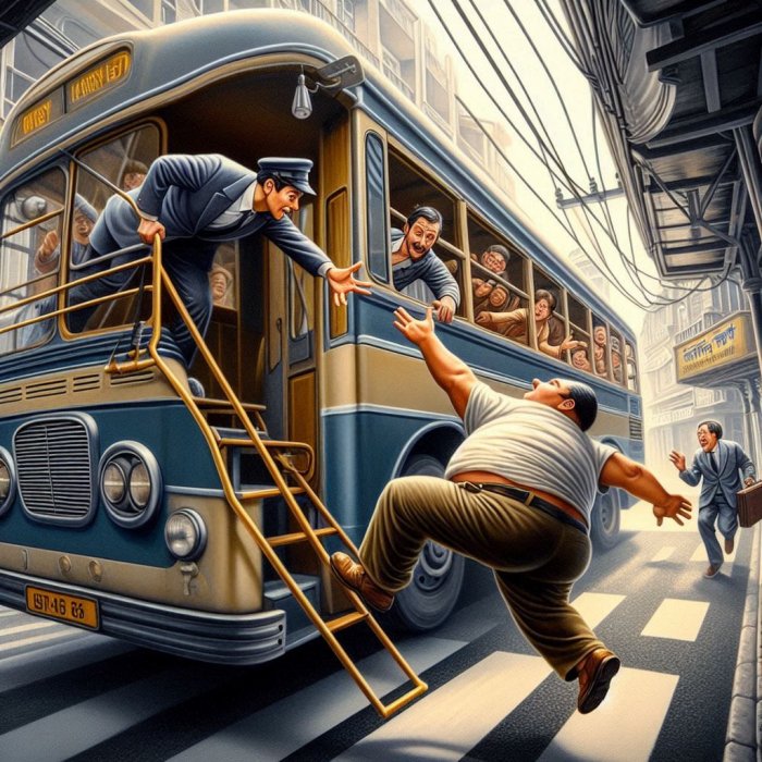 Autobus je krenuo. Kondukter je primetio, pošto je stajao na visećoj stepenici, da jedan čovek trči prema autobusu. U svojoj ''samilosti'' je ispružio ruku. Čovek je dotrčao i uhvatio se za konduktera. Budući da je bio teži od njega, istog trena kada mu je zgrabio ruku povukao ga je iz autobusa i ovaj se našao na ulici. Sada su obojica počeli da trče za autobusom. Korpulentni putnik, koji je bezbedno sedeo u autobusu, kroz prozor im je pružio obe ruke. Obojica su se uhvatili za njih i uskočili u autobus.