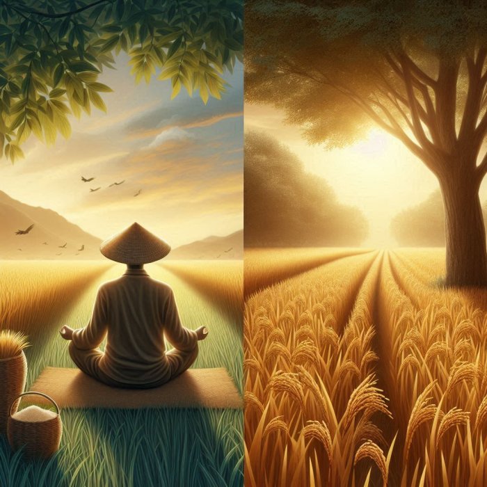 Jedan je čovek svoja polja zasejao pirinčem. Na svoje iznenađenje, posle nedelju dana je otkrio da je, mada je kultura pirinča iznikla, još uspešnije napredovao korov. Čudio se: «Pa ja nisam posejao nikakvo semenje za ovaj korov!» Semenje je već bilo tu, skriveno u zemlji. Kada je ratar zalio iznikli pirinač, korov je rastao još neobuzdanije. Iščupao ga je, ali on je ponovo narastao. Nastavio je da ga čupa iz korena, a u isto vreme je štitio usev pirinča. I usev pirinča je rastao, dok je korov prestao da raste na tom zemljištu kada je sav bio iščupan iz korena. Žetva je bila bogata i obilna, i ratar je bio presrećan.
