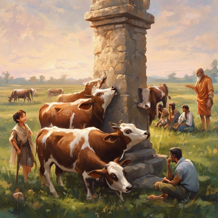 U jednom selu krave su svakoga dana odvođene na pašu. Pošto bi par sati pasle, krave bi se okupile oko čobanina da im češe vratove. Bistri čobanin je u tu svrhu otkrio jedan izum. Bio je to stub sa pomalo hrapavom površinom. Krave bi prilazile stubu i za zadovoljstvom i radošću češale vratove o njega.