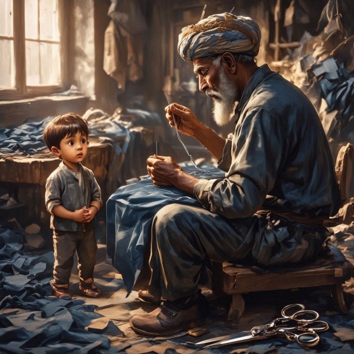 Krojač je prionuo na posao. Uzeo je komad platna i pomoću sjajnih, skupih makaza sekao ga na različite komade. Zatim je makaze spustio pokraj nogu, uzeo malu iglu i konac i počeo da od parčadi platna šije prvorazrednu košulju. Kada je završio sa šivenjem, zabo je iglu u svoj turban. Krojačev sin, koji je sve to posmatrao, upitao ga je: «Oče, makaze su skupe i tako lepo izgledaju, a ti si ih bacio na pod. Igla je gotovo bezvredna, za jedan novčić možeš ih dobiti tuce. A ipak, ti je brižljivo stavljaš na samu svoju glavu. Postoji li neki razlog za to nelogično ponašanje?»
