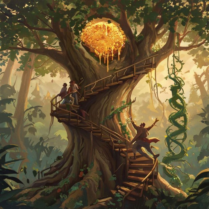 U džungli se nalazilo jedno veliko drvo, a navrh njegove krošnje veoma veliko saće. Ali, bilo je teško popeti se na vrh drveta. Morali su se usecati stepenici u stablu i polako se penjati, a to je zahtevalo veliko strpljenje i inteligentan rad.