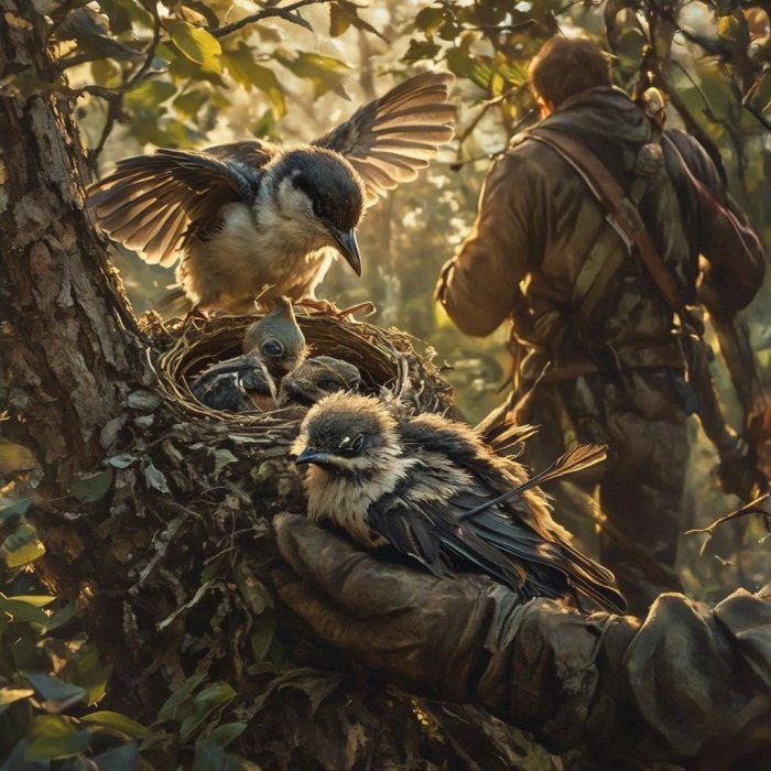 Dve ptice, mužjak i ženka, sagradile su gnezdo u krošnji drveta. Imale su mladunce, koje je ženka čuvala dok bi mužjak odlazio u potragu za hranom. Jednoga dana, dok je mužjak bio odsutan, naišao je lovac i naciljao na ženku. Ova je to primetila, ali nije htela da odleti da lovac ne bi pobio njene ptiće. Koristeći priliku, lovac ju je oborio strelom. Mužjak se upravo tada vratio do gnezda i, zatekavši mrtvu ženku u lovčevim rukama, počeo je da je oplakuje i jadikuje zajedno sa mladuncima. Da je, umesto toga, iskoristio svoja krila, odleteo bi i izbegao smrt. Ali, pošto je sedeo naričući nad smrću svoje partnerke, lovac je drugom strelom oborio i njega. Zatim je još samo trebalo da se popne na drvo i pokupi mladunce. Čitava porodica je tako izginula ni ne pokušavši da se spasi.