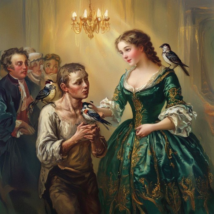 Živela jednom prelepa mlada naslednica ogromnog imetka. Mnogi su je mladići prosili, ali ona je dala prednost jednom siromašnom mladiću ružnog izgleda koji je postao izvitoperen i nepouzdan u svojim svetovnim aktivnostima zbog svoje ljubavi za tu mladu damu. Kada su je ostali udvarači upitali za razlog što je odabrala čoveka koji niti dobro izgleda, niti je bogat ni pametan u poređenju sa njima, ona odgovori: