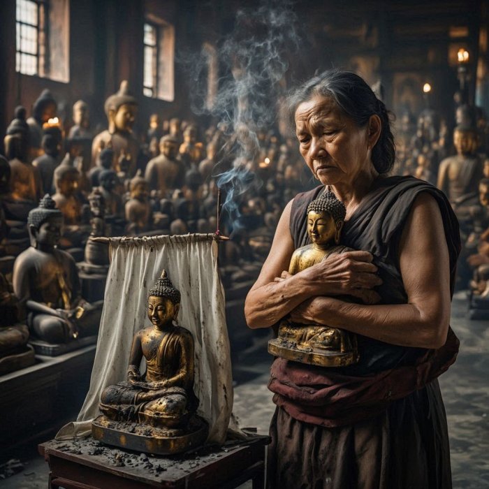 Jedna budalasta posvećenica posedovala je zlatni kip Bude, koji je nosila sa sobom gde god da je išla. Tokom svojih lutanja, stigla je u jedan manastir u kojem su se nalazile stotine kipova Bude. Ali, njoj se nisu dopadale druge Bude, volela je samo svoga Budu. Uvek kada je palila mirisni štapić pred svojim Budom, smetalo joj je što taj dim stiže i do drugih. Navukla je zavesu oko kipa. Za nekoliko meseci njen je Buda potamneo i postao smrknut, dok su drugi još sjajnije blistali.