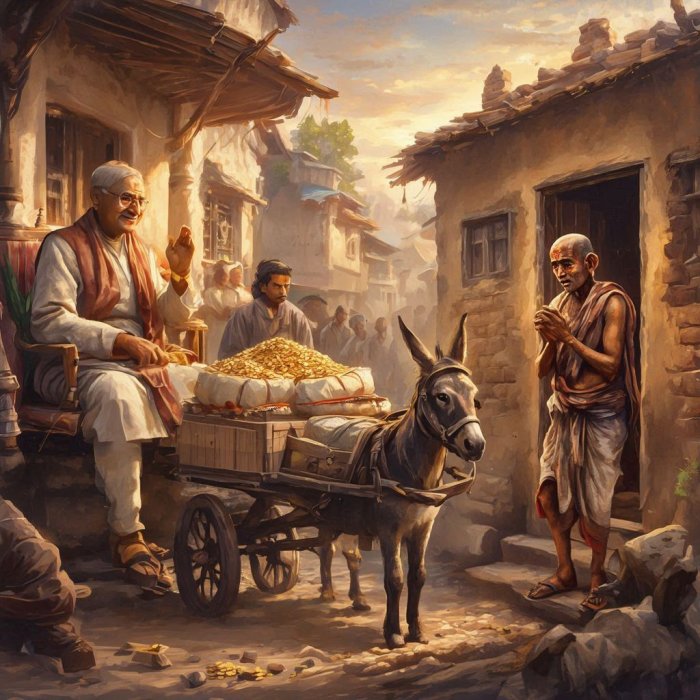 U jednom je gradiću živeo milioner nadaleko čuven po velikodušnosti svoga srca. Ljudi su ga poredili sa Karnom iz Mahabharate, koji nikome ništa nije odbijao. Jednoga dana prišao mu je jedan siromašni bramin kojem je bila potrebna pomoć. Ispričao je milioneru sve svoje nevolje i molio za pomoć. Bogataš mu reče: «Svakako ću učiniti šta mogu da ti pomognem», te ga posla kući. Ubrzo potom, poslao mu je mnogo zlata, pirinča i drugih namirnica, svilena odela i nameštaj. Siroti bramin bio je van sebe od ushićenja. Uopšte nije očekivao toliko toga. Nadao se da će dobiti pet rupija, ali je dobio stvari u vrednosti većoj od hiljadu rupija. No, za bogataša je to bila sitnica, i čak je pomišljao da bramin možda neće biti zadovoljan onim što mu je dao. Zato mu je poslao još poklona, i bramin mu je bio dvostruko zahvalan. «Ne zadajući mi čak ni napor nošenja svih ovih poklona, taj plemeniti čovek mi ih je poslao po svojim vlastitim slugama», razmišljao je sa krajnjom zahvalnošću. Stupio je u milionerovu službu i služio ga celog svog života.