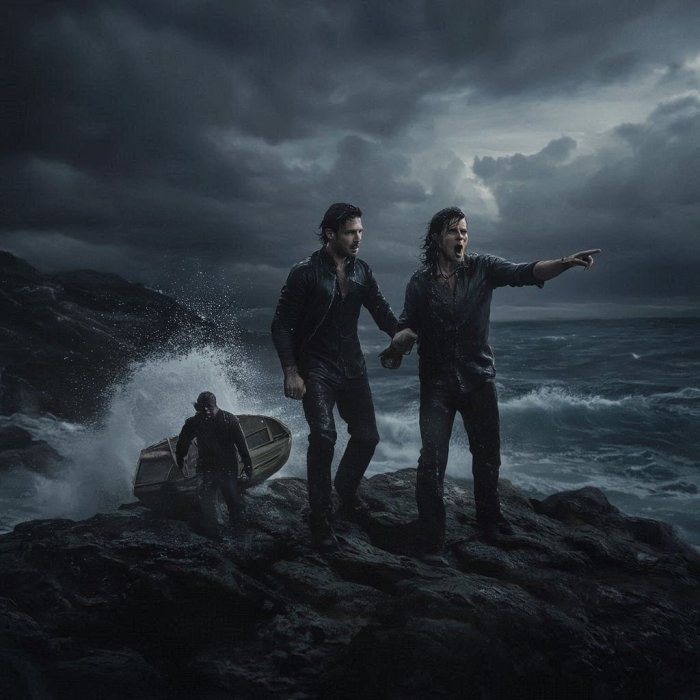 Stoje dva čoveka na hridi u okeanu, podaleko od obale. Smrkava se, kopno se više ne vidi, a oblaci se gomilaju na nebu, talasi udaraju o stenu i okean je sve uzburkaniji.