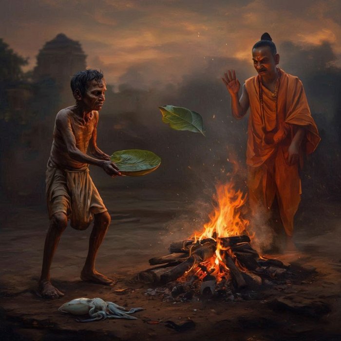 Jedan čovek je upravo završio svoj obrok. On je inače patio od užasne bolesti. Uzeo je veliki list koji mu je poslužio umesto tanjira i, želeći da izbegne rizik da zarazi okolinu, bacio ga u vatru koja je gorela u blizini. To je izazvalo ogorčenje ortodoksnog bramina koji je prisustvovao tom prizoru, pošto je smatrao da je vatra time oskrnavljena. Nije znao šta da radi, ali je osećao da nešto treba učiniti. Šta čovek radi kada je zaprljan? Sipa sebi vodu na glavu i kupa se. Tako je ovaj bramin nepromišljeno sipao vodu na vatru, da je pročisti! Vatra se brzo ugasila, a đubre koje je trebalo da izgori je ostalo. Drugi, inteligentni bramin ukazao je na glupavost ortodoksnog čoveka, i rekao: «Kako si golemu štetu napravio! Otkud vatra, prečistač svega, može da biude zagađena? Onaj čovek koji je bacio list u vatru bio je sasvim u pravu. Da nije to učinio, čitava bi se zajednica zarazila njegovom užasnom bolešću. Vatra bi, međutim, sažegla sve klice bolesti. Ali, umišljajući da je vatra oskrnavljena i stoga je ugasivši, ti si sve nas uvalio u nevolju! Uzvišeno delo pročišćenja koje je vatra vršila obustavljeno je.» Zatim je ponovo naložio vatru, zapalio gomilu đubreta i pretvorio ga u pepeo.