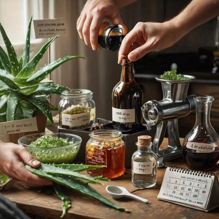 Uzeti 300 g svježe aloje (Aloa arborescens), koja nije mla­ đa od 1 godine ni starija od 5 godina. Prije upotrebe 5 dana biljka se ne zalijeva.  Ta količina listova samelje se na stro­ ju za meso. Tome se doda 250 g cikorije (može i 'Frankov' nadomjestak za kavu), 400 g proljetnog meda sa saćem, 700 g pravog crnog vina i 500 g čistog alkohola. Sve ovo pomi­ ješati i čvrsto začepiti u tamnoj boci,  ostaviti  da  stoji  5 dana  na  mračnom  i  hladnom  mjestu.