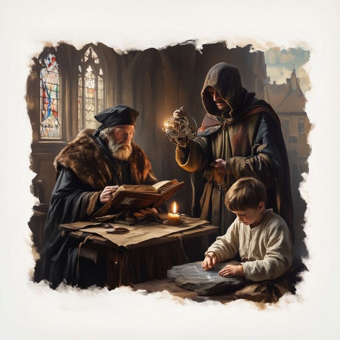 »neprosvijećeni pogani« Azije i Afrike u očima istraživača kasnijih stoljeća, ili, pak, američki Indijanci u očima konkvistadora i kolo nizatora, koji su prvi s njima došli u dodir. Čak su i diplomati, po slanici, dvorjani i vladari obično bili nepismeni grubijani, koji nisu poznavali filozofiju, povijest, kulturu, pa čak ni zemljopis. Tiskarski stroj tada još nije bio izumljen, stoga su knjige bile malobrojne. Crkva je većinu djela zabranila, zaplijenila i uspostavila tako mono pol nad učenjem. Tek kada su, kao posljedica rekonkviste i križarskih ratova, uspostavljene veze s islamskom, židovskom i bizantskom misli, Europa se počela »civilizirati«, u uobičajenom smislu te riječi.