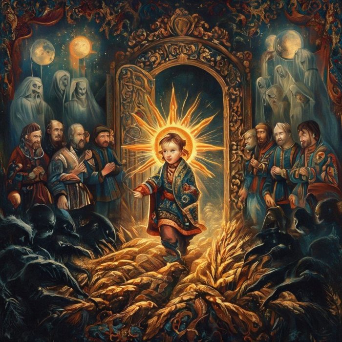 Po već kazanom u prijašnjim dijelima ovoga rada, ovaj veliki gospodin i veliki lovac ne može drugo da bude, do Vid-Odin. Gozba u trpezariji prilikuje gozbi u Walhalli, u Rajevini. Jednaka djeca, dvanaestorci, to su Sunčevi likovi, rogjeni od Vida i Vide. Jedno je dijete u gospodskom domu, dok druga djeca izbivaju na selima, t.j. u svakom mjesecu vlada po jedno Sunce.