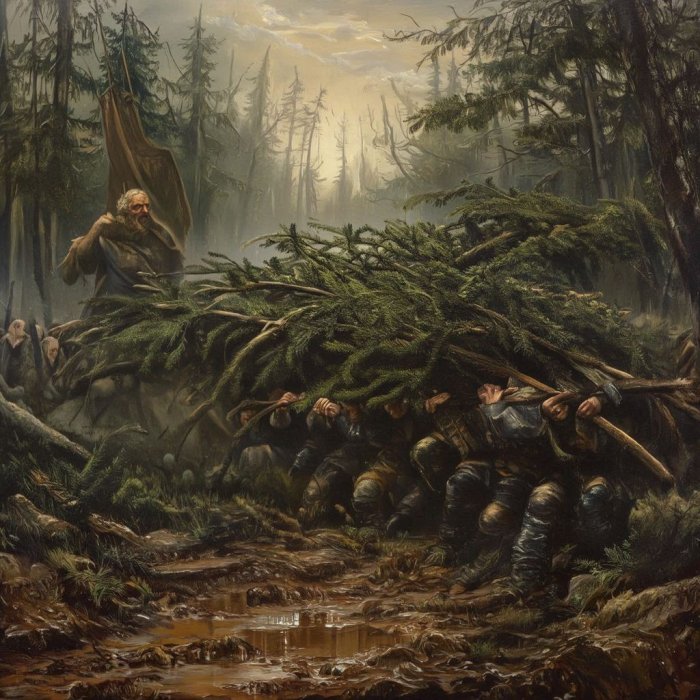Jelove grane ukršene, te nošene od vojske koja se pod njima skriva, sjećaju nas odmah na jednaki prizor u Shakespeare-ovu Macbethu, uzet zacijelo iz skotske mitične tradicije. Nego, šta to može biti, mi razaznajemo iz potpunijeg našeg mita: dobitno, al prenejako Sunce, još se krije po umučkanoj šumi. Ban, otac Lazi, Banović Stefan, kao što i car gospodin, otac Mari, po svoj je prilici mitični Banović Strahina, vrhovni gospodar i roditelj sviju bogova, roditelj Laze Sunca i ognjene Marije, svetoduhe Janje. Uza sve drugo, sunčani mit u ovoj pjesmi zasvjedočuju riječi: ''tad se Mara suncu okrenula, ljubi Lazu u čelo junačko''.