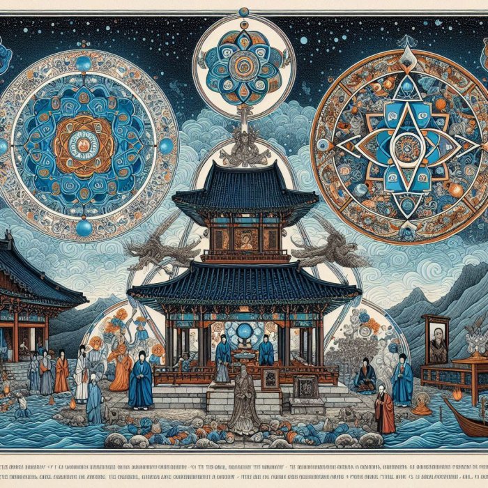 Tradicionalna korejska pučka religija, kao i kineska, mješavina je konfucijevskih, budističkih, taoističkih i animističkih elemenata. Njezina kozmička hijerarhija podudara se s našim kozmološkim modelom.