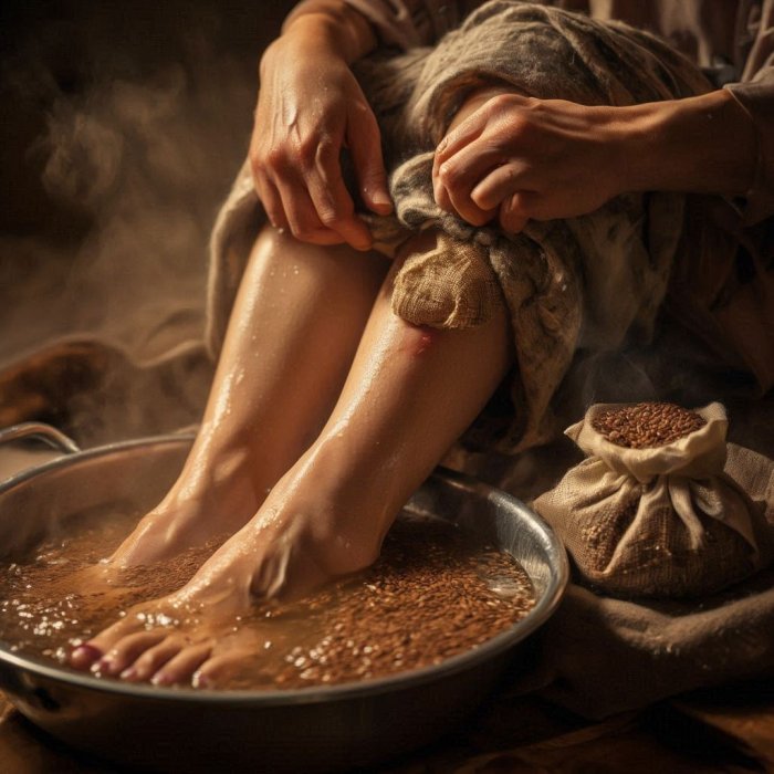 Laneno sjeme (50  g)  kuha  se  20  minuta  u  3  litre  vode. U toj se tekućini navečer operu noge. Sjeme se stavi u vre­ ćicu, dok je topla i stavi na bolno mjesto. Noge se zaviju u toplu vunenu krpu. Kura traje još mjesec dana i nakon što se  bolesnik  osjeća  posve  zdrav.