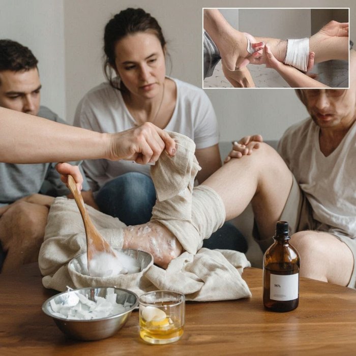 Ako je noga ili ruka iščašena, treba je namjestiti na nje­ no prirodno mjesto. Zatim nastrugati dječjeg pjenušavog sa­ puna, dodati dva bjelanjca od jajeta i nešto 96 posto jakog alkohola (špirita). Tu smjesu treba dugo drvenom kuhačom miješati dok se ne zapjeni. Tada tu masu nasuti na gustu la­ nenu krpu ili vatu i obaviti oko uganutog mjesta. To se dva­ put dnevno ponavlja. Bolovi će ubrzo proći.