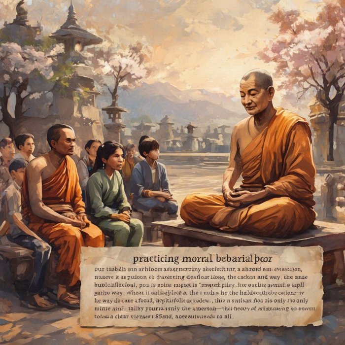 – Govori istinu i čvrst je i postojan u istinoljubivosti, vredan poverenja, pouzdan, otvoren u nastupu. On miri posvađane i ohrabruje ujedinjene. Uživa u harmoniji, želi harmoniju, raduje joj se i stvara je svojim rečima. Njegov govor je nežan, prijatan za uho, ljubazan, srdačan, uljudan; mnogi se sa njim slažu i u njemu uživaju. On govori u pravo vreme, prema činjenicama, prema onome šta je od koristi, prema Dhammi, prema Kodu ponašanja. Njegove reči vredno je pamtiti, govori pravovremeno, dobro sagledano, dobro izabrano i konstruktivno.4