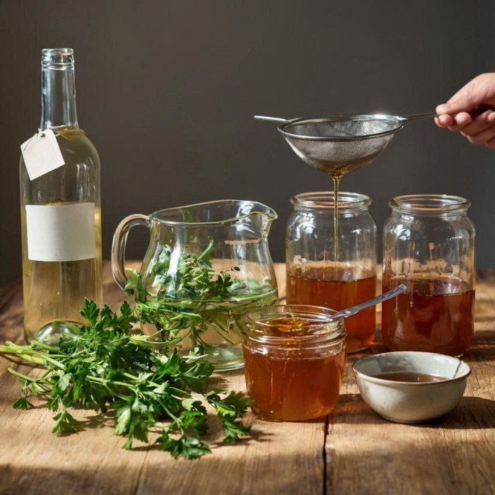 Kad je gotovo, skinuti s vatre, kuhačom izvaditi peršin i tako vrelo uliti u pripremljenu tamnu bocu . Zatvoriti plutenim ili plastičnim čepom i ostaviti da se hladi .