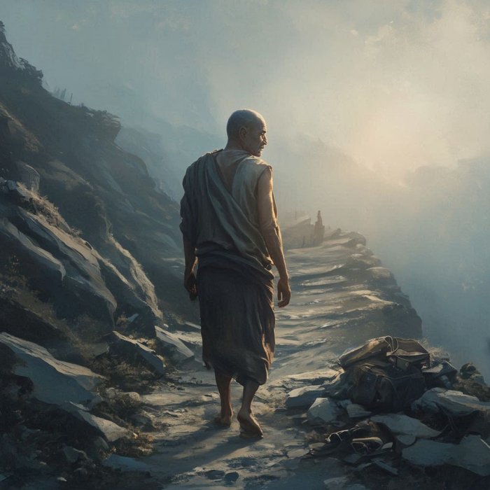 Prakticirajte odricanje od sad nadalje, kako biste mogli krenuti na put kad dobijete poziv! Nitko ne zna kad će poziv doći i zato nema razloga plakati u tom trenutku razmišljajući o stvarima koje ste akumulirali, slavi koju ste stekli ili naslovima koje ste osvojili! Orlu dosađuju vrane, sve dok u svom kljunu nosi ribu. Vrane prolijeću pored orla kako bi mu ukrale ribu iz kljuna. One progone pticu gdje god sleti da malo odmori. Na kraju, orao se odriče vezanosti za ribu i ispušta je iz svog kljuna; vrane polijeću za ribom i ostavljaju orla na miru. Isto tako, kad se vi odreknete senzualnih zadovoljstava, vrane ponosa, zavisti, zlobe i mržnje će odletjeti dalje i ostaviti vas u miru.
