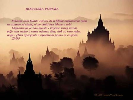 "KOLIKOM JE MJEROM BOG POSUO SVOJIM SVJETLOM COVJECJI ROD, TOLIKOM SU MJEROM LJUDSKA BICA SUSTINSKI JEDNO. ALI U ISTINI, NJEGOVA JE SVJETLOST NEDJELJIVA".  Rumi je ovdje instrument, a uistinu je i ova sentenca odjek Bozjeg glasa. Danasnjim tihovanjem se ponovno ili opetovano usredotocavamo na odgovornost prema daru, ili zadatku ili ulogu: