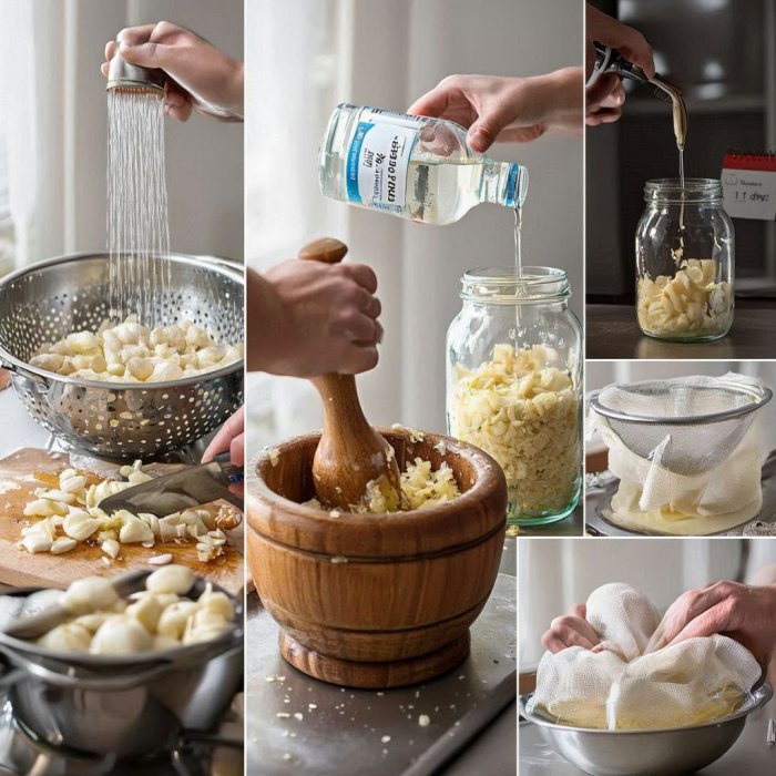 Dobro očistiti i isprati 350 grama bijelog luka (češnjaka), rasjeći ga i istucati drvenim tučkom u većoj drvenoj ili plastičnoj posudi. Istučeni češnjak staviti u staklenku i onda naliti 3 dcl 96% alkohola (dobije se u svakoj ljekarni) te čvrsto zatvoriti posudu i čuvati je 10 dana na prohladnom mjestu. Po isteku 10 dana, treba sadržaj posude procijediti kroz čvrstu tkaninu (gaza ili pelena). Ostatak koji ostane u tkanini treba također čvrsto procijediti (stisnuti rukama). Procjeđeni ostatak treba još 2 do 3 dana držati na hladnom mjestu (hladnjaku) i započeti liječenje. Lijek se uzima tako da se otopina pomiješa sa 0,5 dcl mlijeka (četvrt čaše) na sobnoj temperaturi prema slijedećem rasporedu: