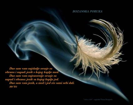 A Ja cu ti hitrom strujom poslati casu vina na plovecemu pladnju, i jos jastuk od pjene, i jos cvijet plavoga mirisa. Sve sto pozelis Ja cu ti poslati; pod uvjetom da ne pozelis otuzni vonj hrome vode, sto se lijepi o obalu.