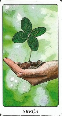 U ovoj karti SREĆE se dogodilo miješanje i preklapanje Ciganica i Lenormandica. U starim Ciganicama žena iz roga obilja obasipa zemlju. NOva verzija iste karte je prikazana običnom četverolisnom djetelinom koja je najstariji talisman za sreću pronađen u prirodi, no djetelina je preuzeta iz Lenormand karata.