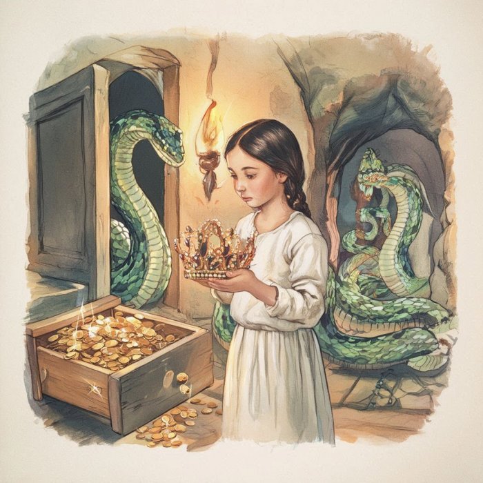 Sedme godine povela je zmija djevojku svome ocu u skrivenu jamu kako bi je nagradio što ju je pazila, no naučila ju je da od sveg blaga, što joj njezin otac, Kačec, car zmijski ponudi - jedino krunu traži.I tako je djevojka od Kačeca krunu dobila, donijela ju doma i stavila u ladicu. Kad je sutra ladicu otvorila da pogleda krunu, a ono unutra cijela hrpa zlatnika.